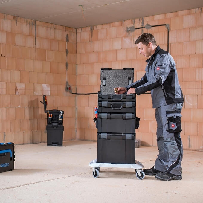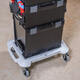 Made from durable plastic and equipped with four smooth-running swivel casters, the L-BOXX Dolly is not only mobile but also strong: with a load capacity of up to 220 lbs, it handles service calls, job sites, and workshop use with ease. Two of the wheels can be locked for stable positioning wherever you need it.