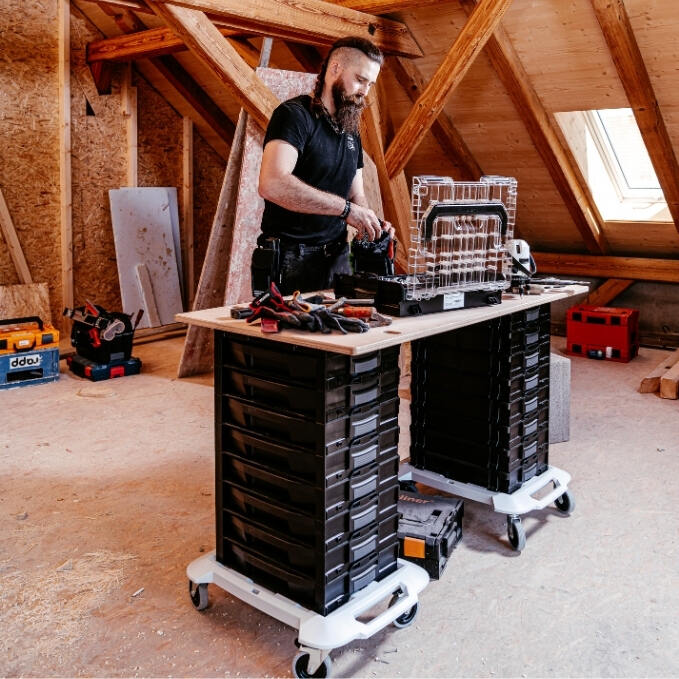 The robust platform dolly is the mobile foundation of your L-BOXX system, getting your L-BOXXes to the job site safely and effortlessly. Thanks to its intuitive click mechanism, every L-BOXX can be securely fixed to the platform – for hassle-free mobility.