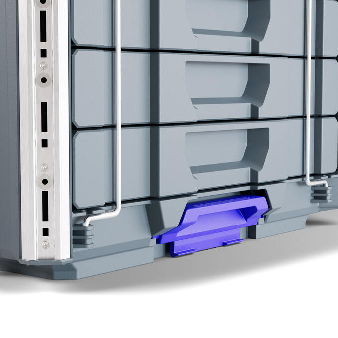 Sturdy, foldable metal latches keep drawers secure during transport, while side handles make carrying easy. Integrated aluminum rails provide added stability and serve as docking points for ProClick tool pouches and holders, while M6 threaded inserts offer additional options for safely attaching even more accessories.