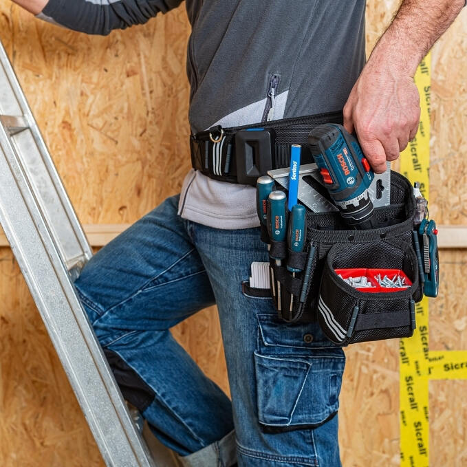 Whether it’s screwdrivers, combination pliers, Allen keys or any other essentials you need throughout the day– 15 elastic loops and 16 mini loops bring order to where there would otherwise be chaos. The practical outer pocket is compatible with organizer bins and adds extra space for screws, bits & more. Need extra gear? Just clip it onto the carabiner loop. And when it’s time for a break, simply stand the pouch up securely thanks to the smart built-in stand.
