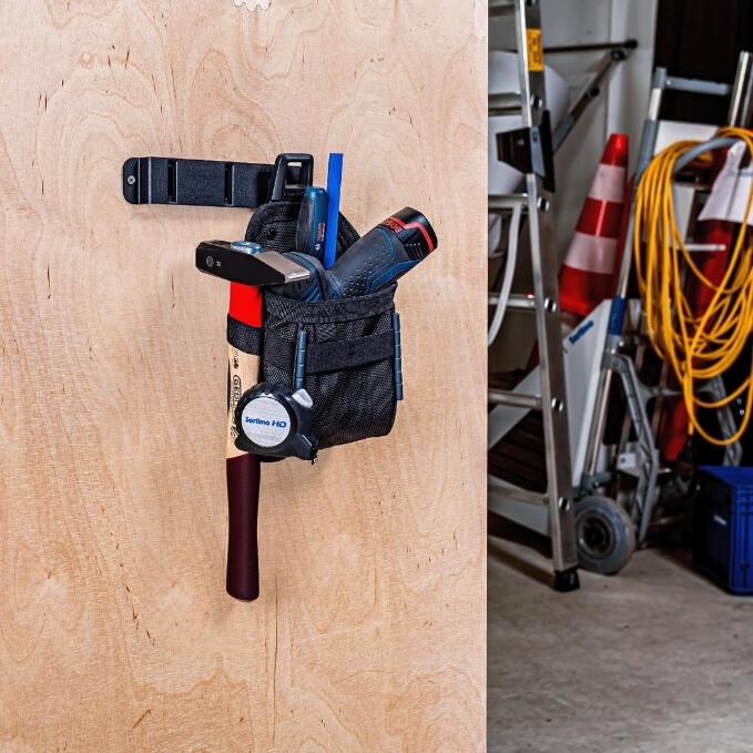 Tool pouches or holders can be positioned in seconds and easily removed when needed.
